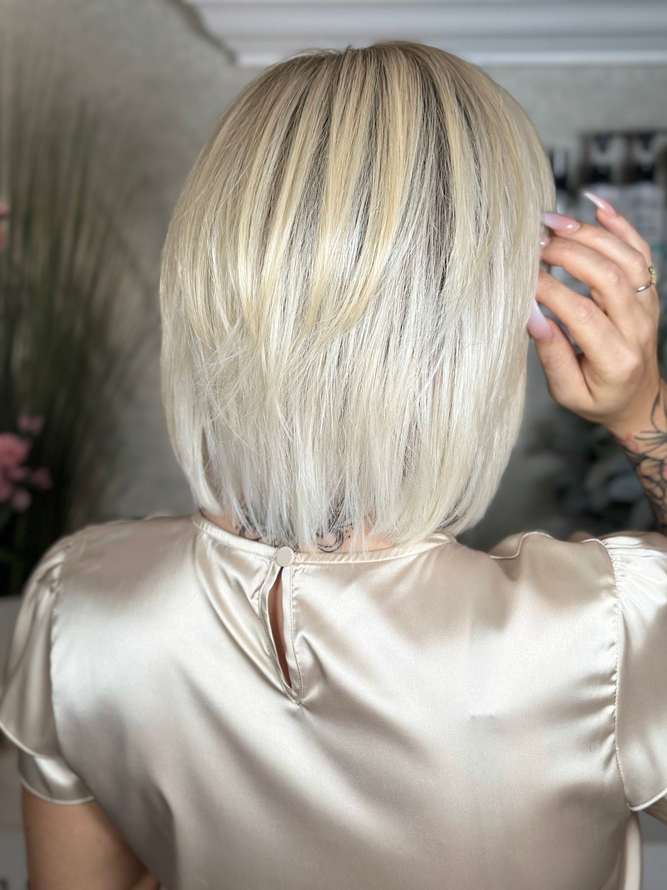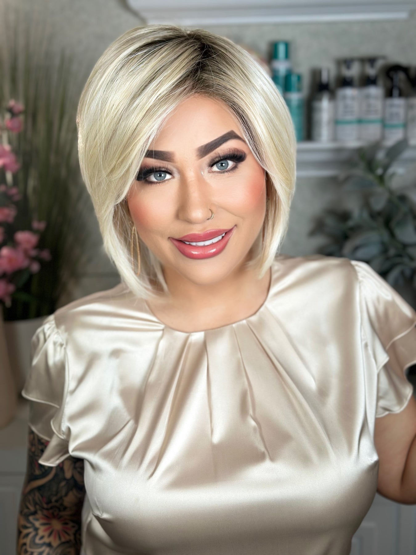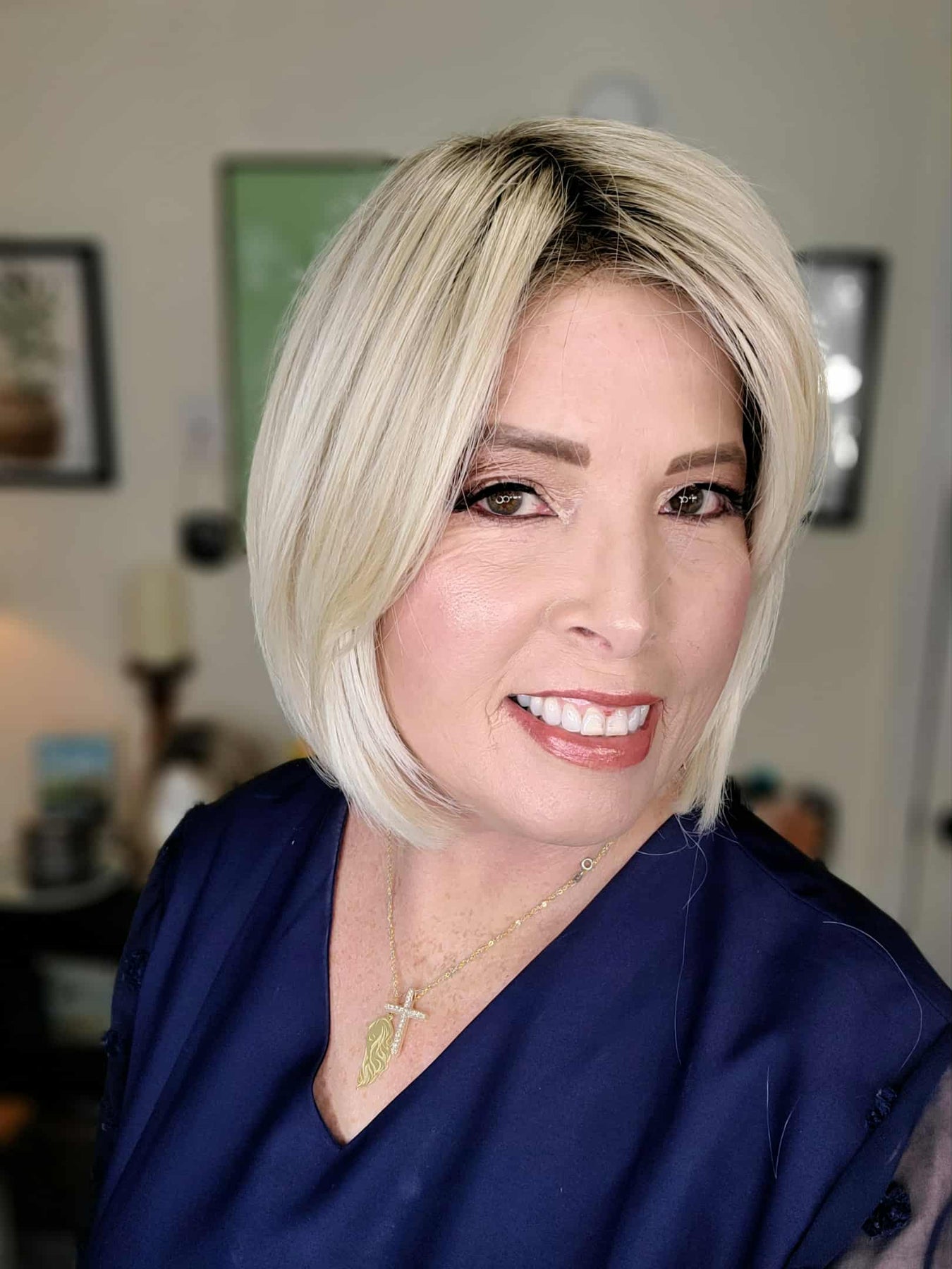 Bad Habit is a sleek, silky bob with soft layers falling just past the collar for an effortlessly chic look. Its lightweight density mimics the feel of fine human hair, while the hand-tied monofilament top and lace front create a seamless, natural hairline. Designed for all-day comfort and endless versatility, Bad Habit can be parted in any direction and styled to suit your mood—making it the perfect blend of polish and ease.