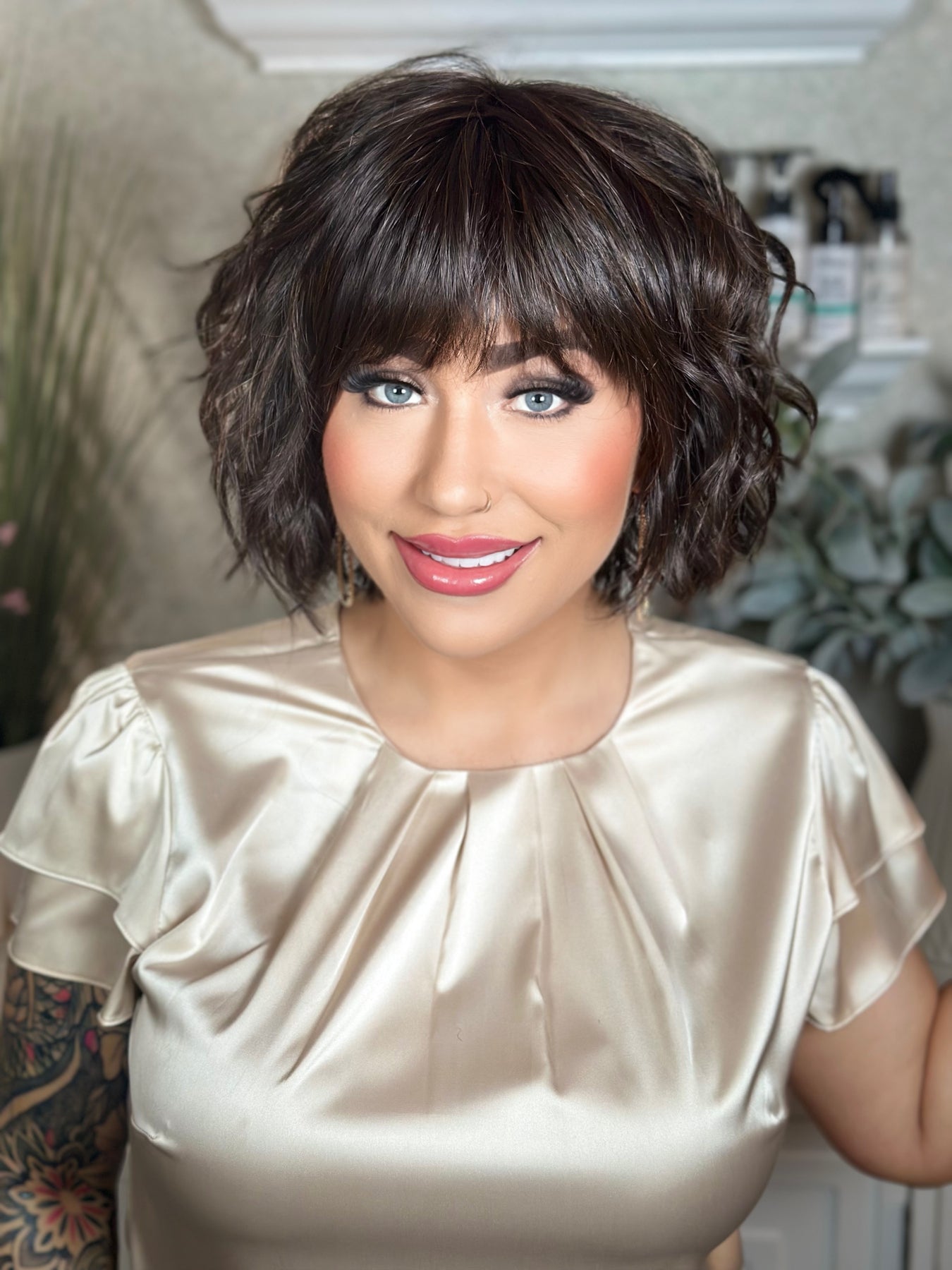 Classy Sass is a polished layered bob with a touch of soft beach wave, offering a sleek silhouette that falls just below the collar. Its airy, light density creates natural movement, while the hand-tied monofilament top provides a realistic hairline and allows for versatile parting. Crafted from premium heat-friendly fibers that mimic the look and feel of fine human hair, Classy Sass delivers effortless sophistication with all-day comfort.