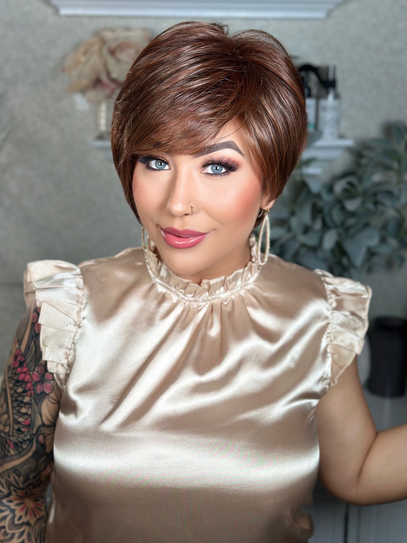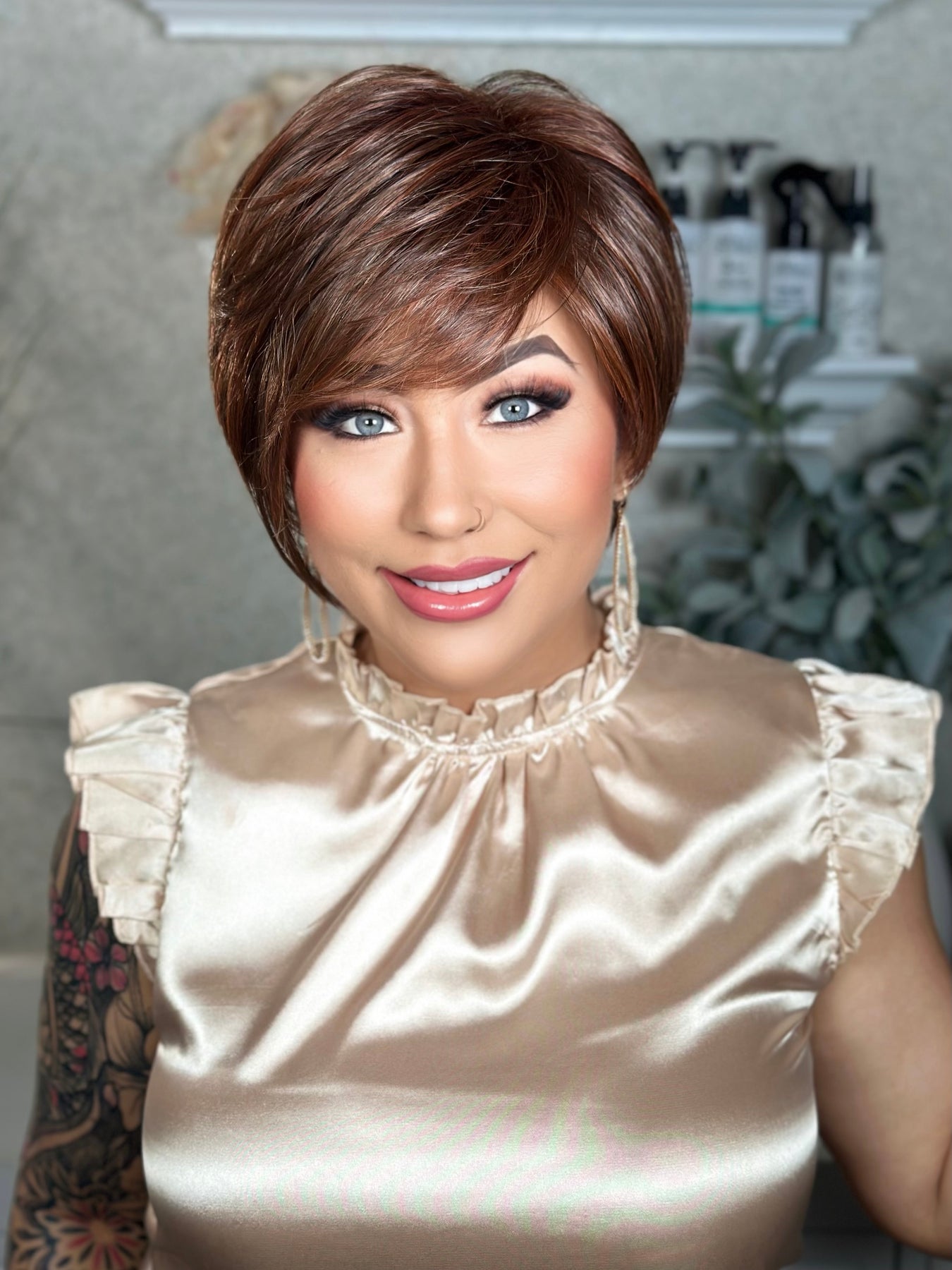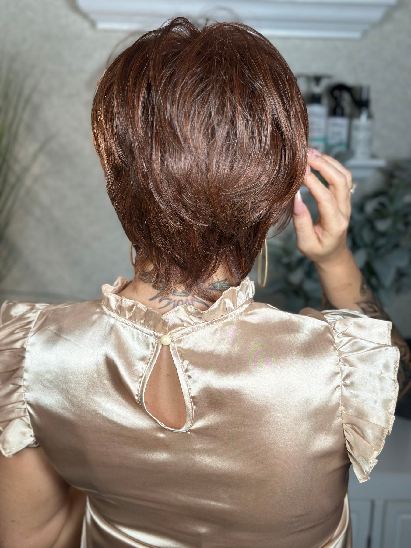 This asymmetrical pixie brings a modern twist to a timeless style. With soft, feathered layers and subtle volume, it frames the face beautifully while offering just enough length to tuck behind the ears or sweep forward for a flirty look. Lightweight and versatile, it’s perfect for everyday wear, special occasions, or even experimenting with a bold new color—making it a flattering choice for anyone ready to switch up their style with confidence.